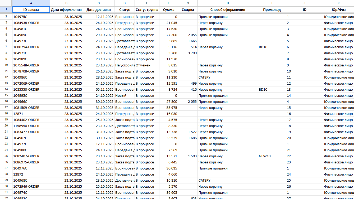Таблица содержит полную информацию по заказам и интегрирует данные о клиентах, продажах, источниках трафика и промокодах: