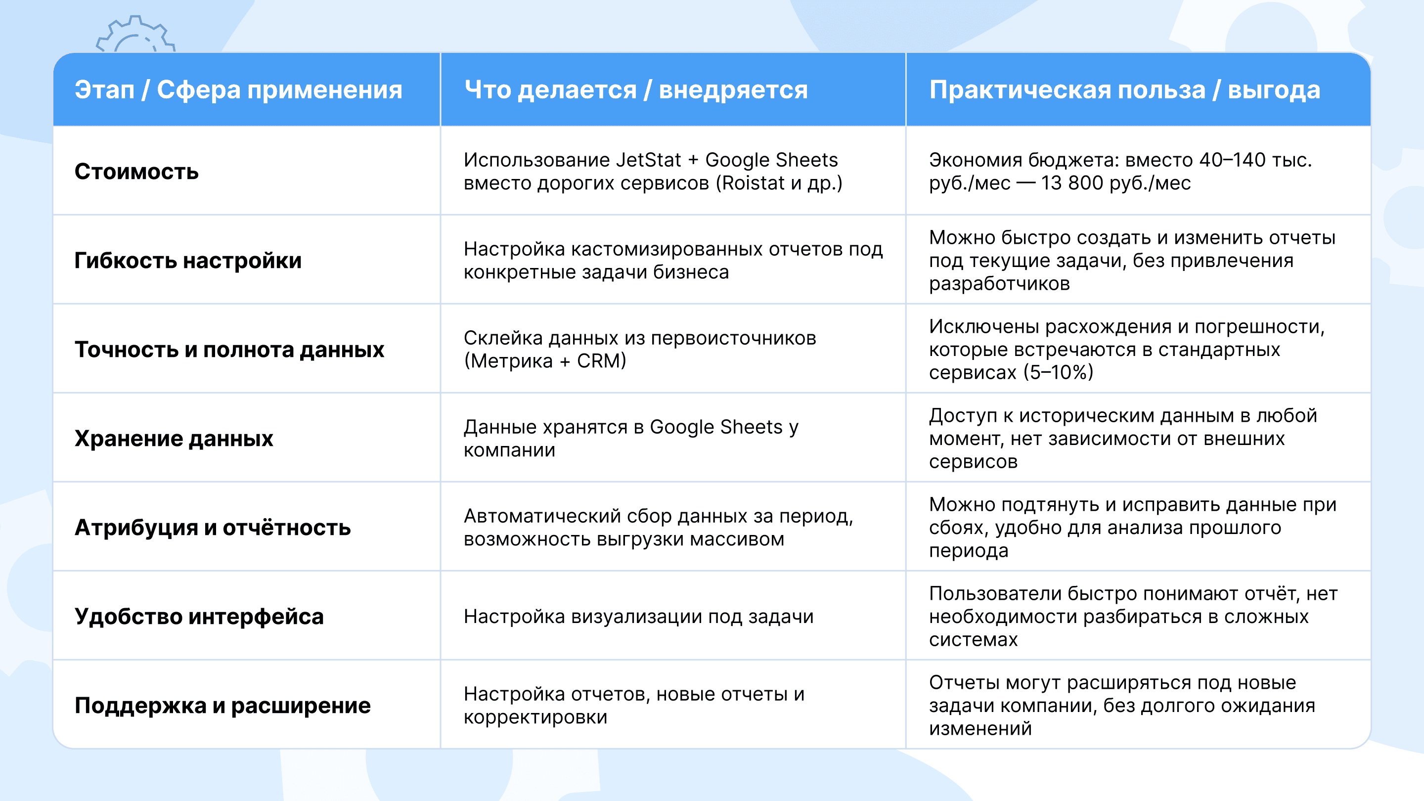 Таблица настраивается под любые бизнес-задачи, позволяет объединять источники данных и проводить детализированный анализ в одном месте.