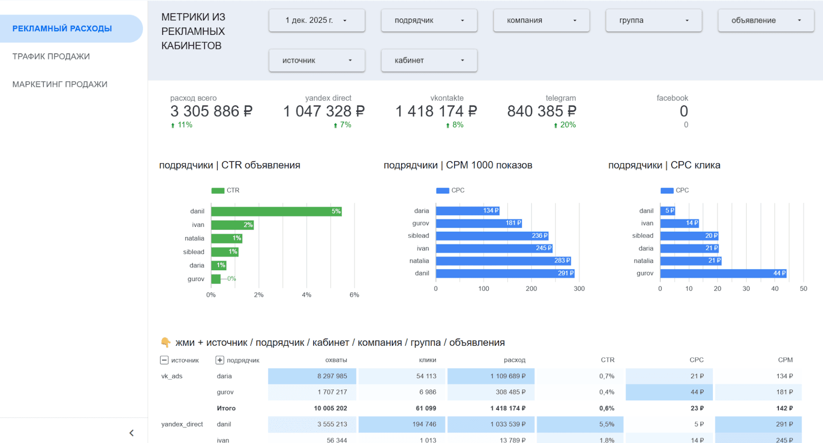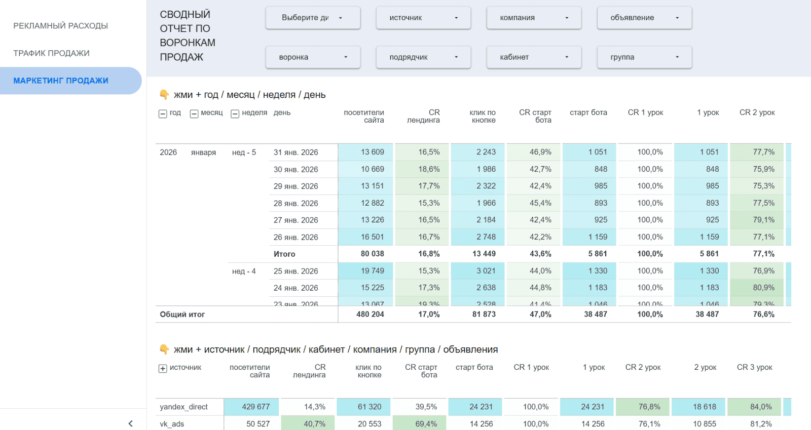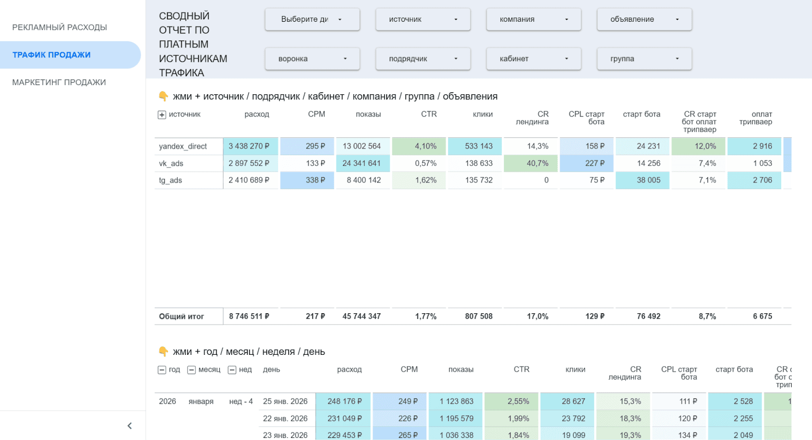 Отчёт гибко настраивается: можно фильтровать данные по нужным срезам и выводить только те показатели, которые важны для конкретной роли - собственника, маркетинга или отдела трафика.