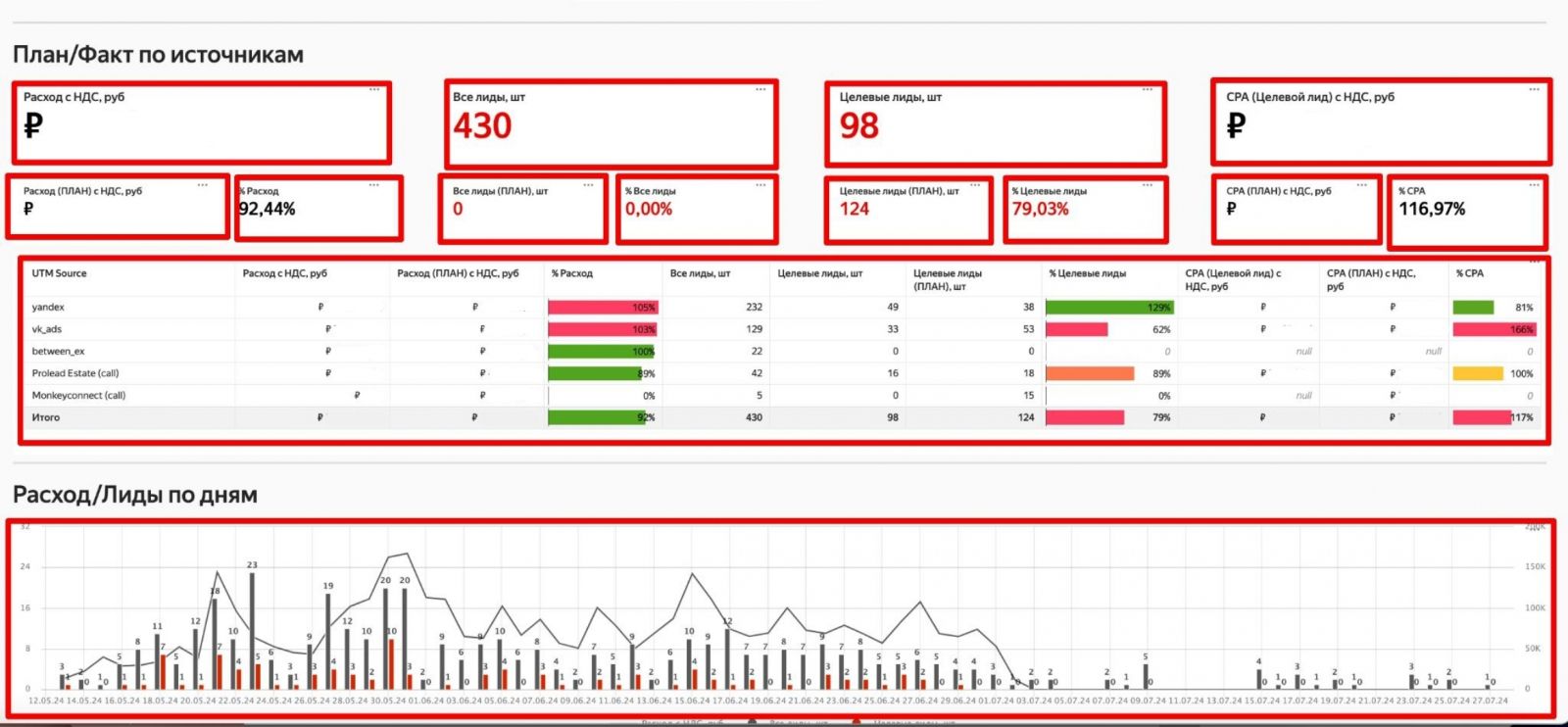 Отдел аналитики и топ-менеджмент AGM используют дашборды для стратегического анализа всего портфеля проектов. Эти инструменты позволяют не только оценивать текущую эффективность, но и строить прогнозы на основе исторических данных. Например, система дает возможность мгновенно сравнить среднюю стоимость целевого лида для бизнес-класса в Москве с аналогичным показателем для апартаментов в Ленинградской области, выявляя региональные особенности и рыночные тренды.