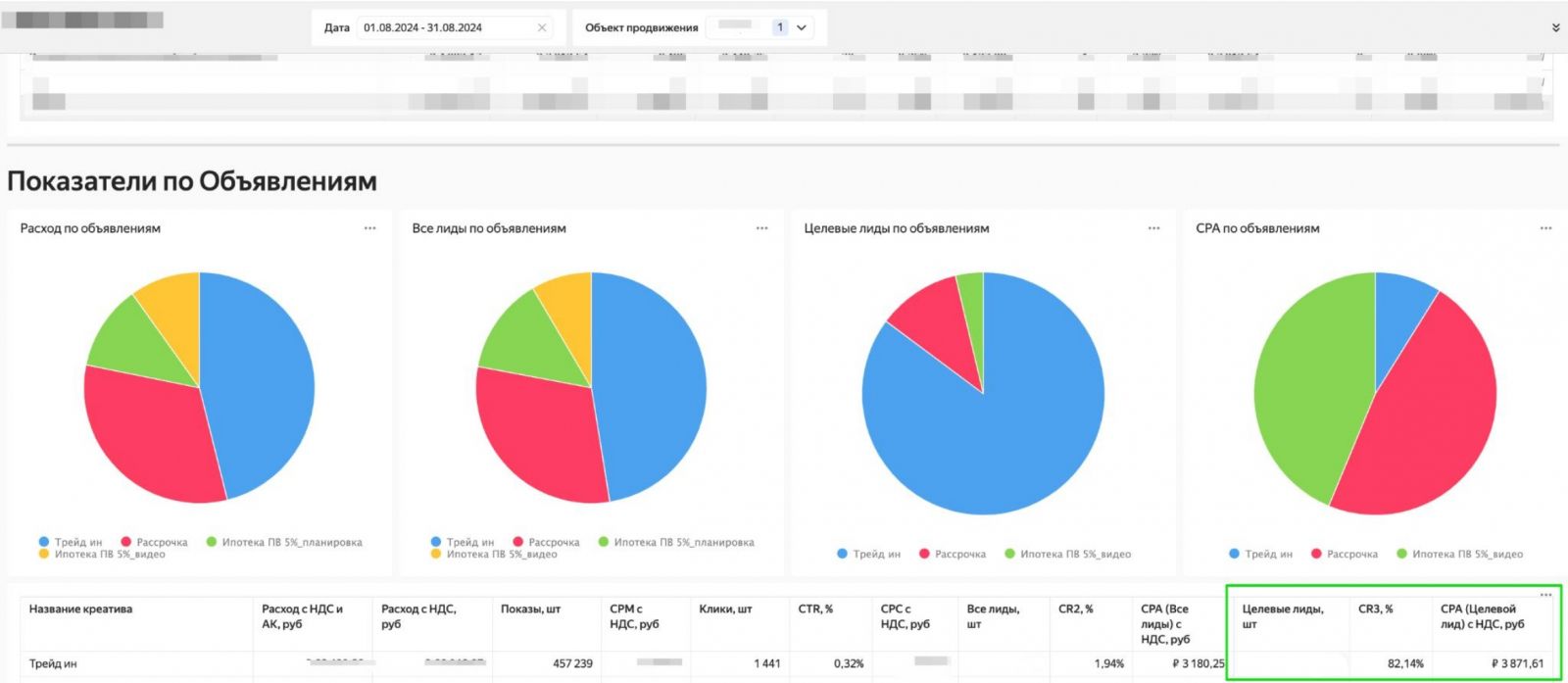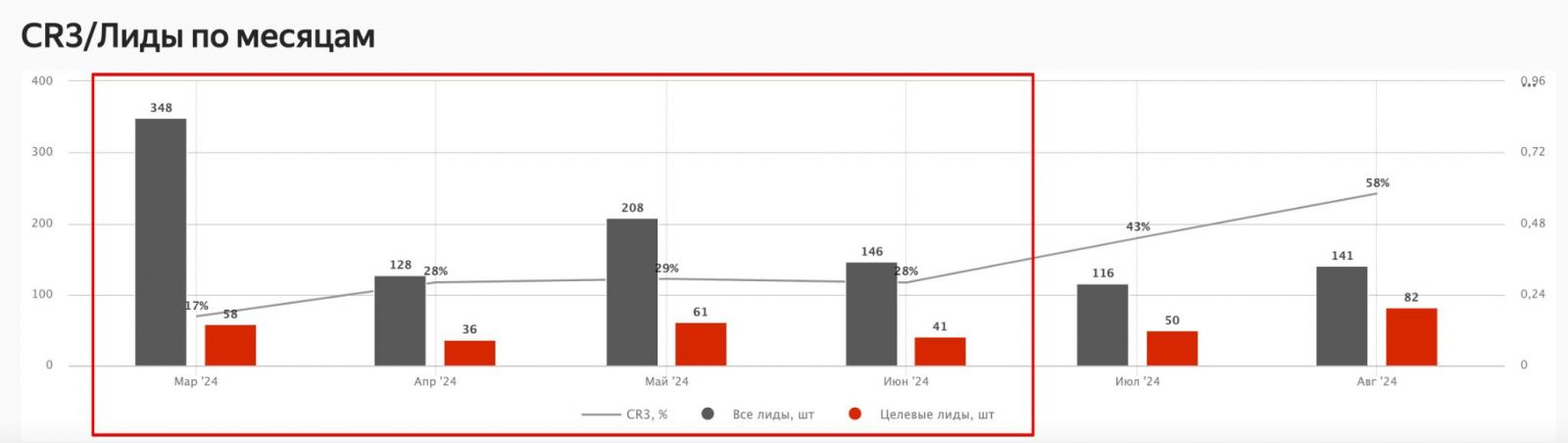 В августе 2024 года анализ дашбордов AGM выявил проблему низкой конверсии лидов из Рекламной сети Яндекса в целевые обращения. Исходные значения (август 2024):
