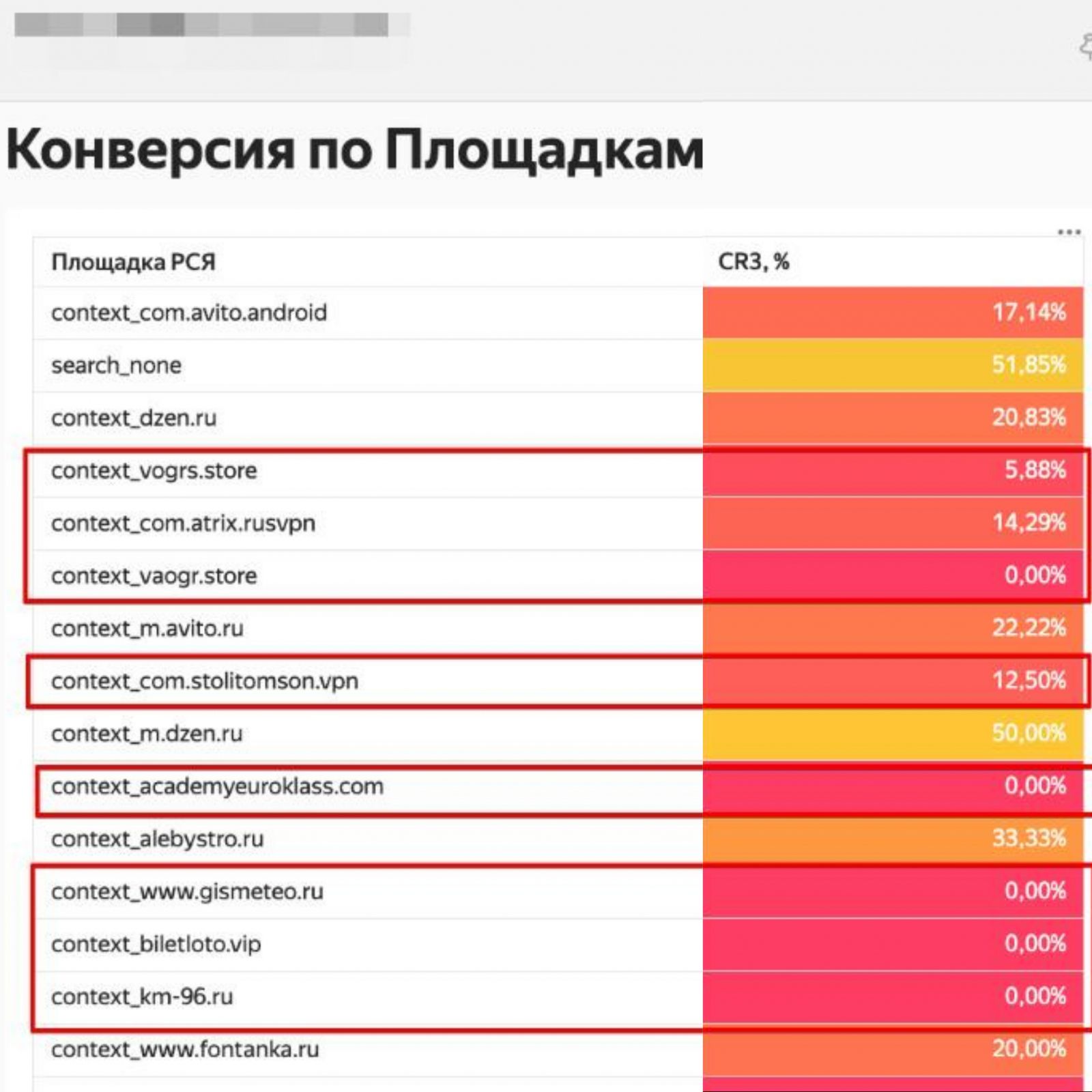 Для решения проблемы специалисты провели детальный анализ площадок РСЯ, определили источники с наименьшей конверсией и исключили их из рекламных кампаний: